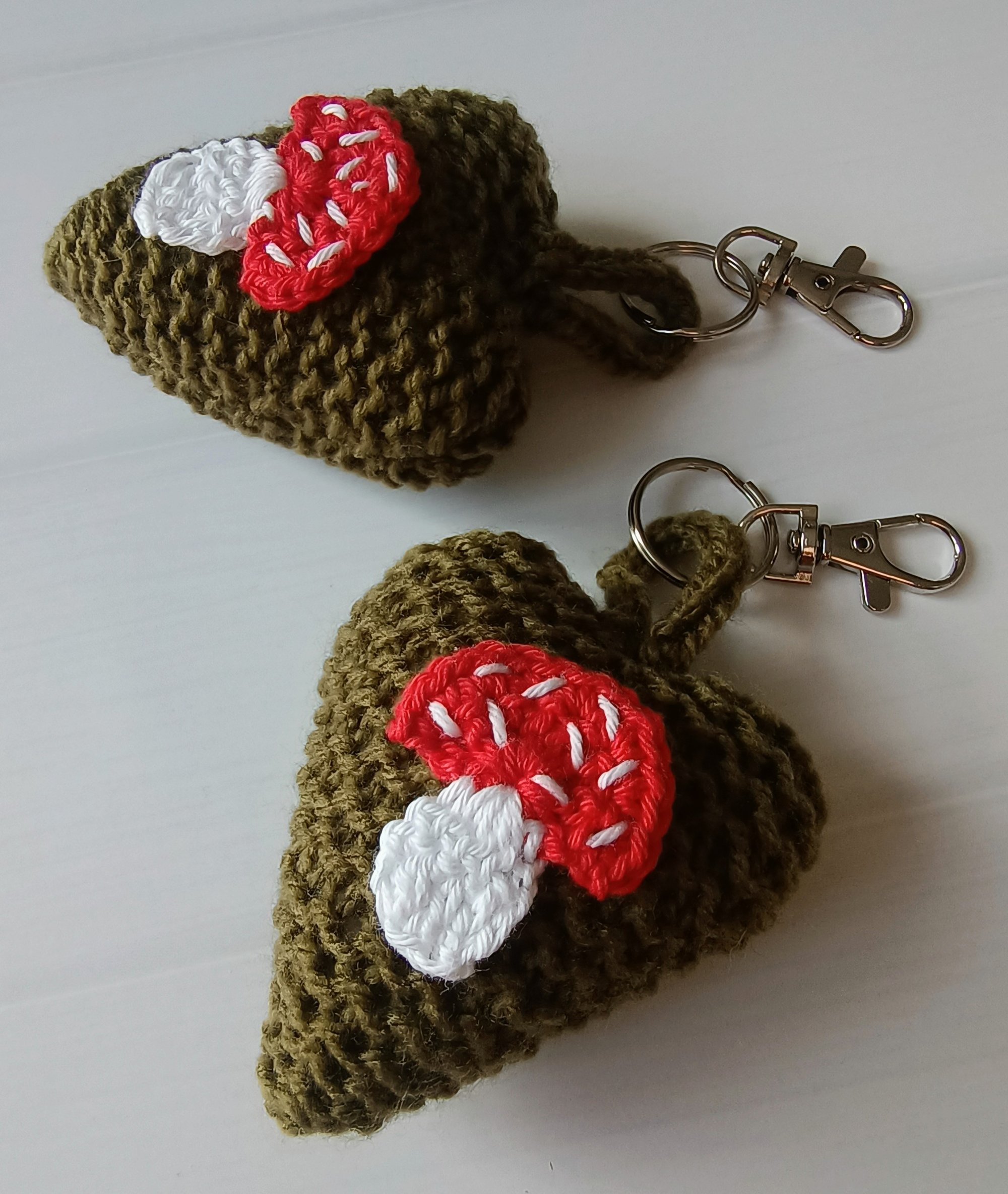 A chunky heart shaped bag charm, in forest green with toadstool applique detail. Hand knitted and filled with toy safe stuffing.